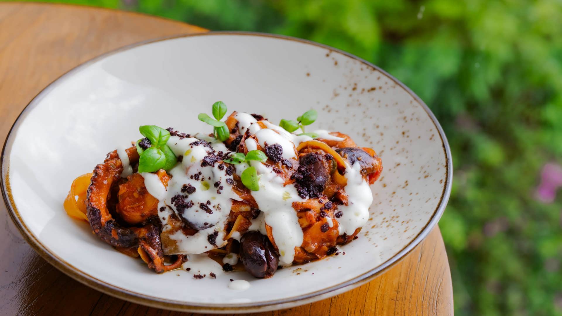 carries the weight of slow-cooked octopus—tender without collapse—layered with black olives, capers, tomato sauce,